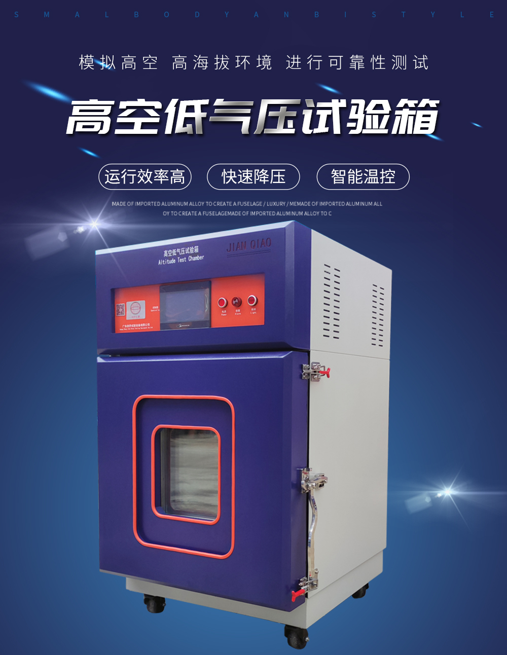 • 高空低氣壓試驗箱可以模擬高海拔、高空、(高原地區)氣候進行貯存運用、運輸可靠性試驗,并可同時對試件通電進行電氣性能參數的測試設備。適用于國防工業,航天工業自動化零組件,汽車部件,電池,平面顯示屏模組工業及相關產品料進行環境試驗 - 高溫試驗、低溫試驗、溫度變化試驗、低氣壓試驗、溫度高度試驗、低溫/低氣壓綜合試驗、高溫/低氣壓綜合試驗。