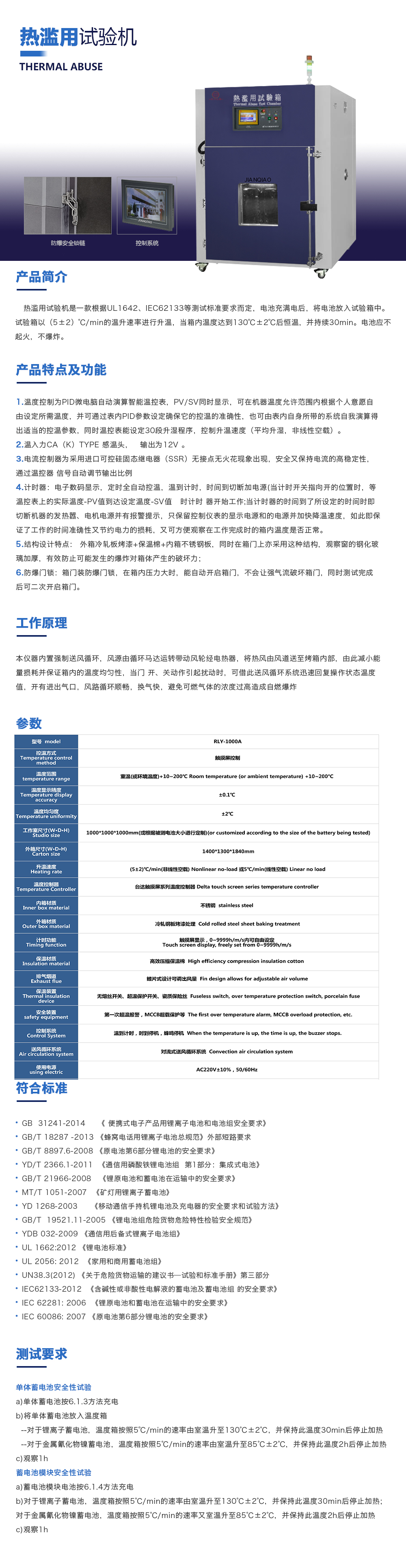 用途:熱濫用試驗箱是一款根據UL1642、IEC62133等測試標準要求而定,電池充滿電后,將電池放入試驗箱中。試驗箱以(5±2)℃/min的溫升速率進行升溫,當箱內溫度達到130℃±2℃后恒溫,并持續