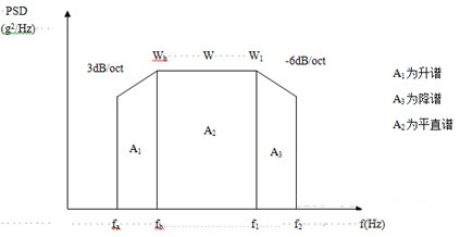 為了簡便起見,往往將功率譜密度曲線圖劃分成若干矩形和三角形,并利用上升斜率(如3dB/oct)和下降斜率(如-6dB/oct)分別算出wa 和w2,然后求各個(gè)幾何形狀的面積與面積和,再開方求出加速度總均方根值。