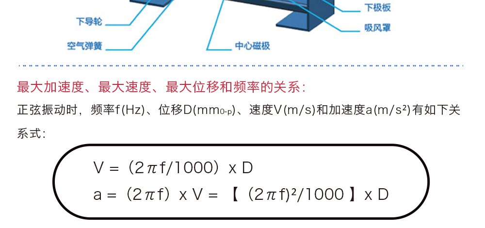 用途:正弦振動時,頻率f(Hz)、位移D(mm0-p)、速度V(m/s)和加速度a(m/s2)有如下關(guān)系式:
